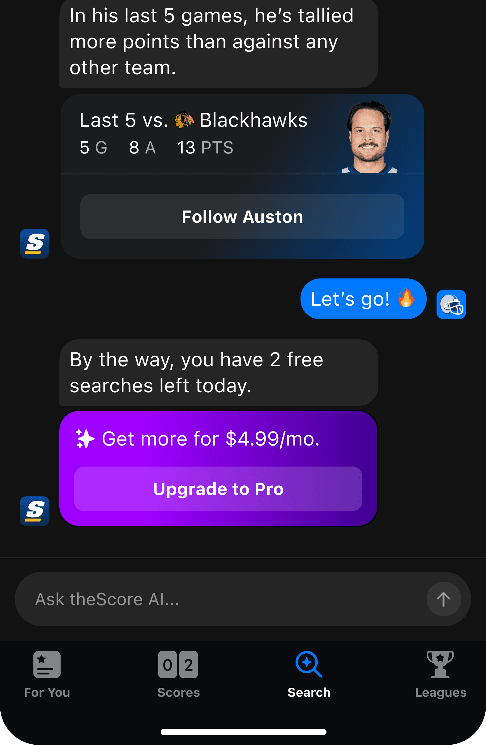 A concept exploring how theScore could harness its data and LLM’s to power a conversational UI that delivers insights and content, helping users make smarter betting and fantasy decisions.