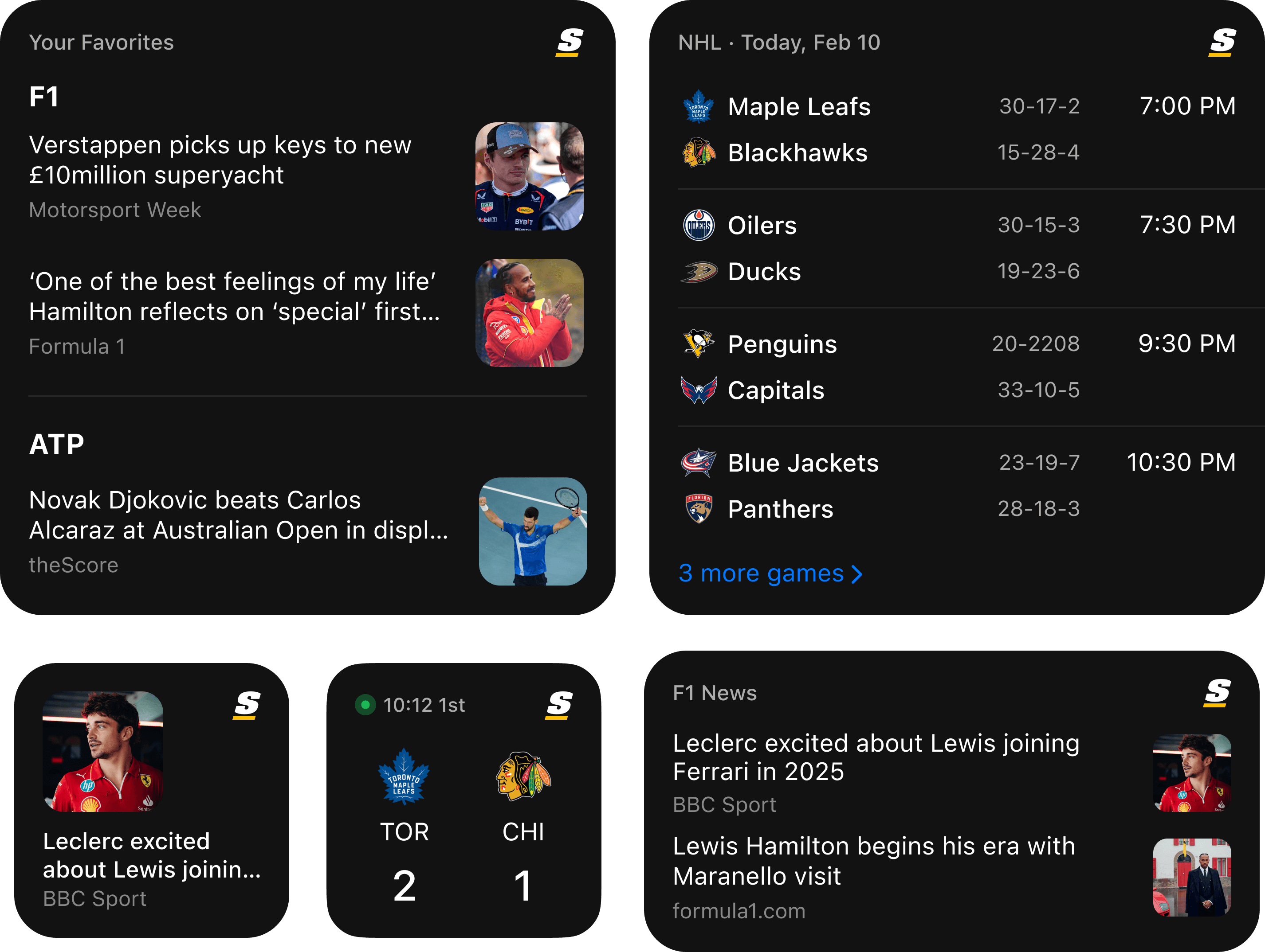 Concepts for how theScore could expand it's collection of home screen widgets to include news and favorites, utilizing the small, medium and large widget sizes.